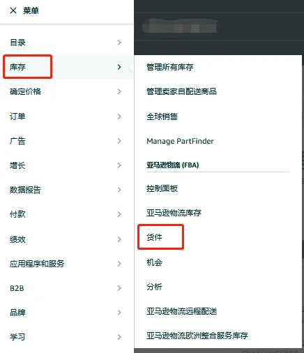 🔘 第一步:通过卖家平台“菜单>库存>货件”进入货件处理进度页面。
