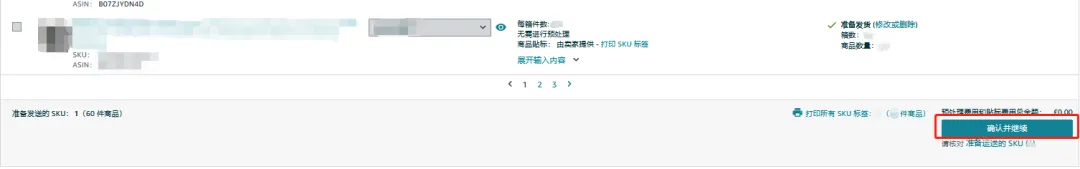 🔘 第四步:确认发货的SKU以及数量后,点击“确认并继续”。