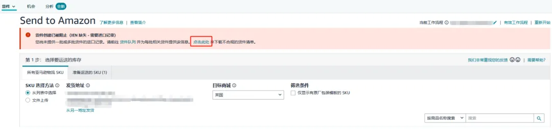 🔘 第七步:在您创建一个新货件工作流程,且成功完成“Send to Amazon”的“第1步-选择要运送的库存”后,您将会立即恢复创建英国货件的权限,“货件进度页面”的标语“货件创建已被阻止”将会消失。