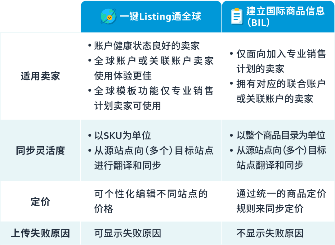 小编罗列了“一键Listing通全球”和“建立国际商品信息(BIL)”间的具体差异以便各位卖家们查看: