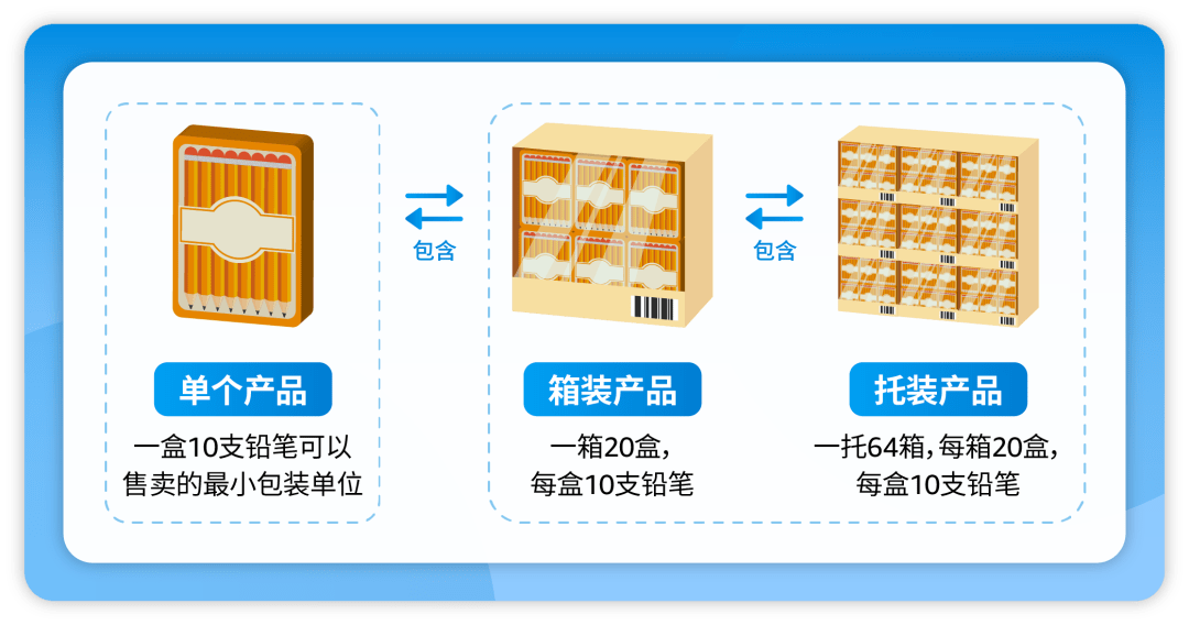 ☆ 多层级包装展示可以由单件装、大包装和托装组成: