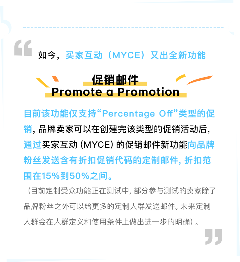 看到这里,对于买家互动(MYCE)与其新功能“促销邮件Promote a Promotion”的用法都熟悉了吗?旺季将至,快来与品牌粉丝建立更紧密的联系吧!
