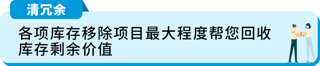 清理冗余库存,卖家还可通过以下库存移除项目,按照价值回收由大到小的顺序来最大程度地释放库存空间,节约库存管理成本,最大限度回收滞销库存的剩余价值。
