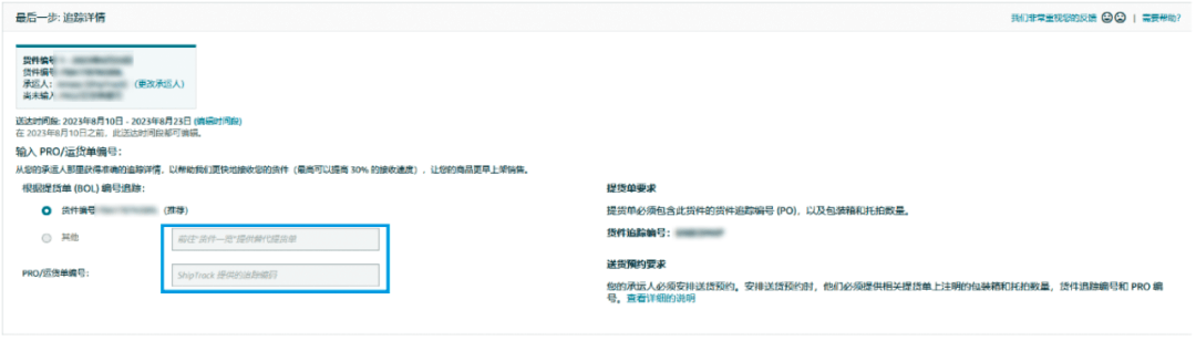 在最后一步中,卖家不再需要提供货件追踪单号(托拍配送不再需要填写提货单编号或者PRO/运货单编号;小包裹快递货件不再要求填写追踪编码。)