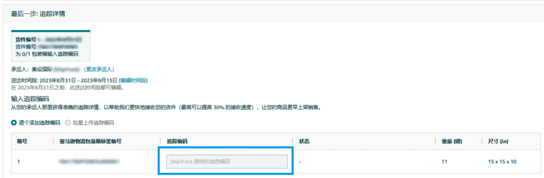选择承运商后,亚马逊将自动为卖家填写追踪编码,不需要卖家再手动输入,进而简化发货操作,提高入仓效率。