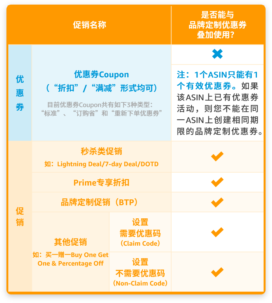 作为优惠券“家族”的一员,品牌定制优惠券可以与多种促销叠加使用,进一步满足卖家的促销引流需求!您可通过下方表格,直观了解品牌定制优惠券的叠加使用规则: