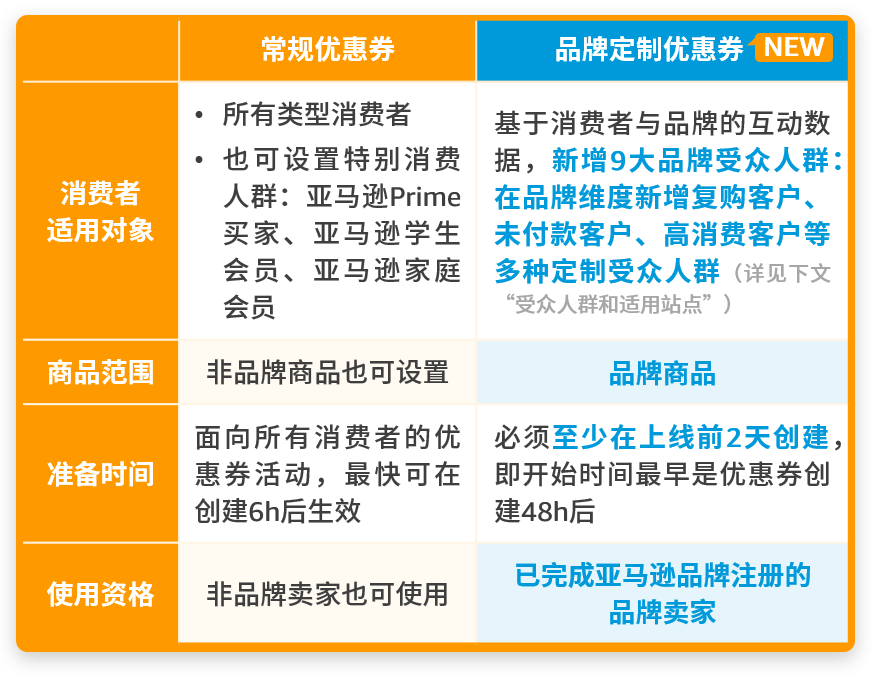 您可通过下表了解品牌定制优惠券与常规优惠券(Coupon)的区别:
