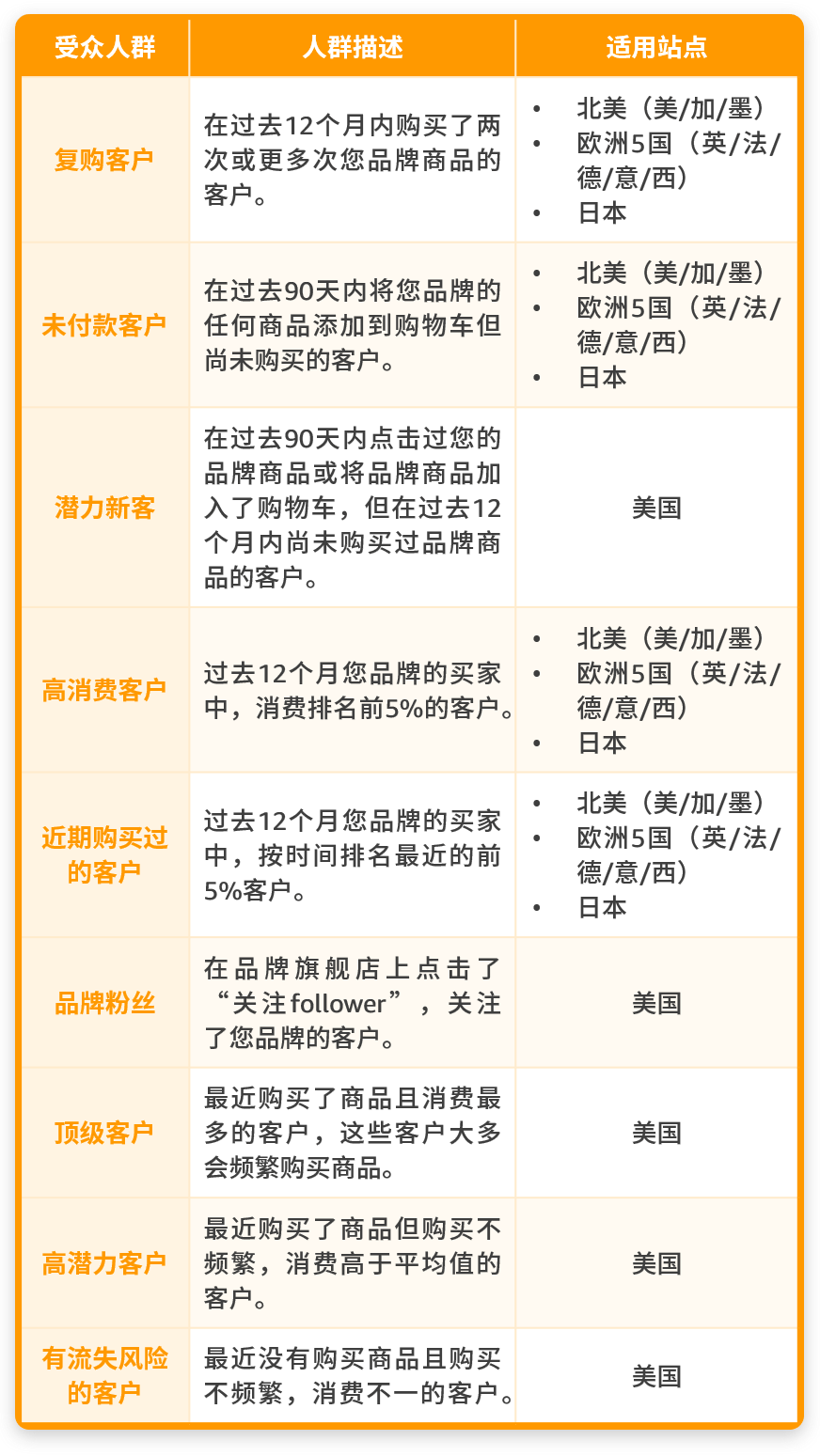 目前已开放欧洲5国(英/法/德/意/西)和日本,将于24年2月起面向北美(美/加/墨)开放(不同站点可使用的品牌受众人群不同,详见下表)。