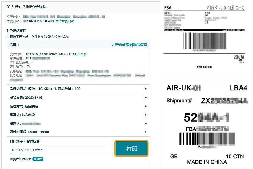 打印箱子标签,点击打印后,会自动生成FBA标签和运输标签,请和箱号一一对应贴于货件上。