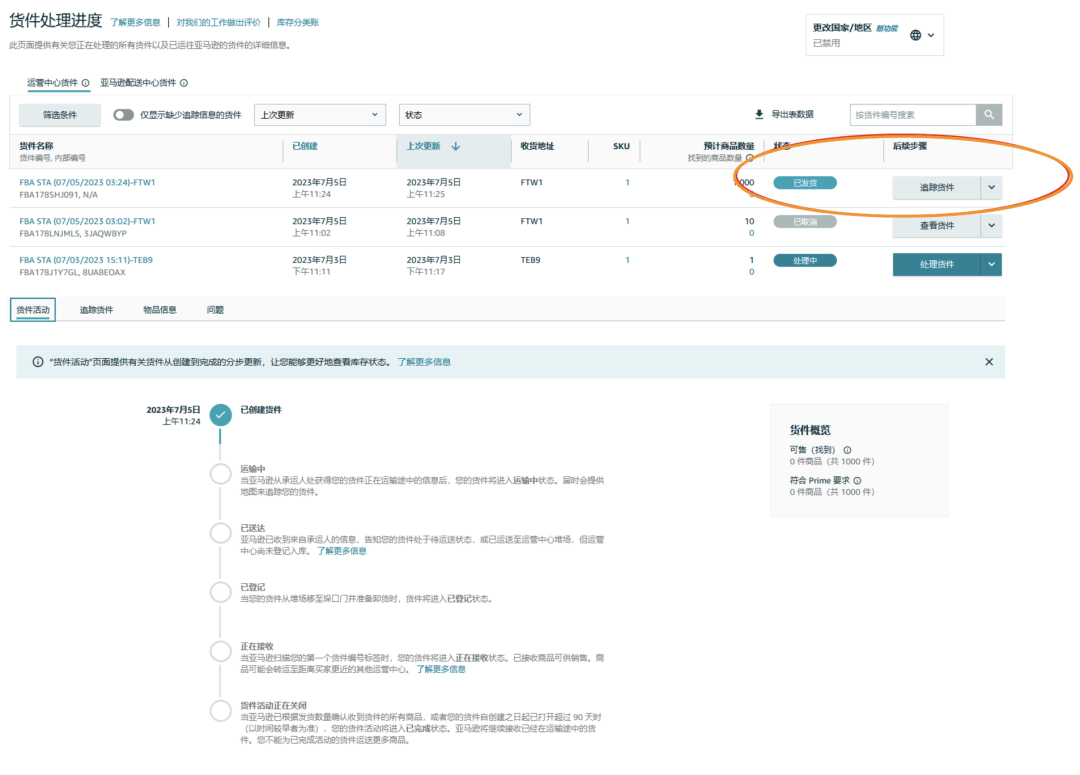 选择要运送的库存,勾选要出运的SKU,并填写数量,点击“准备发货”按钮。