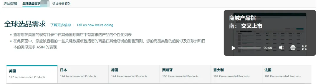 Tips:在“全球销售”页面,您也可以看到“全球商品需求”推荐。“全球商品需求”功能当前仅对美国站卖家开放,不论是否在欧洲站或日本站开店均可查看。