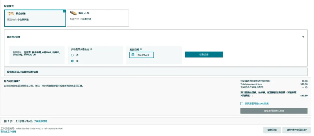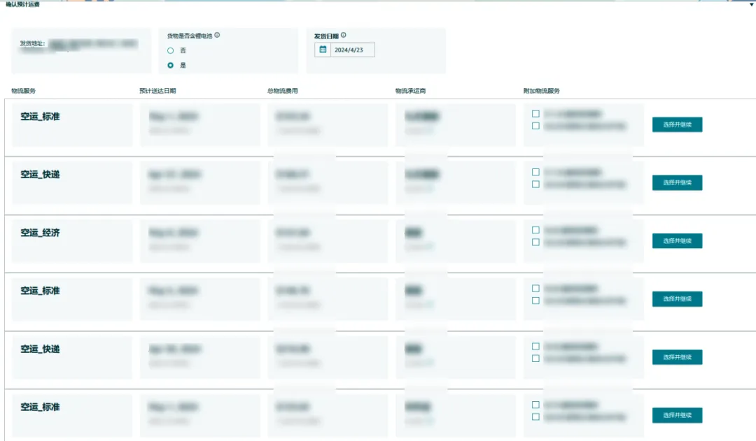 选择配送模式和承运人后点击继续使用提供配送方, 若您在上一步选择【航空快递】服务,您将看到以下界面。