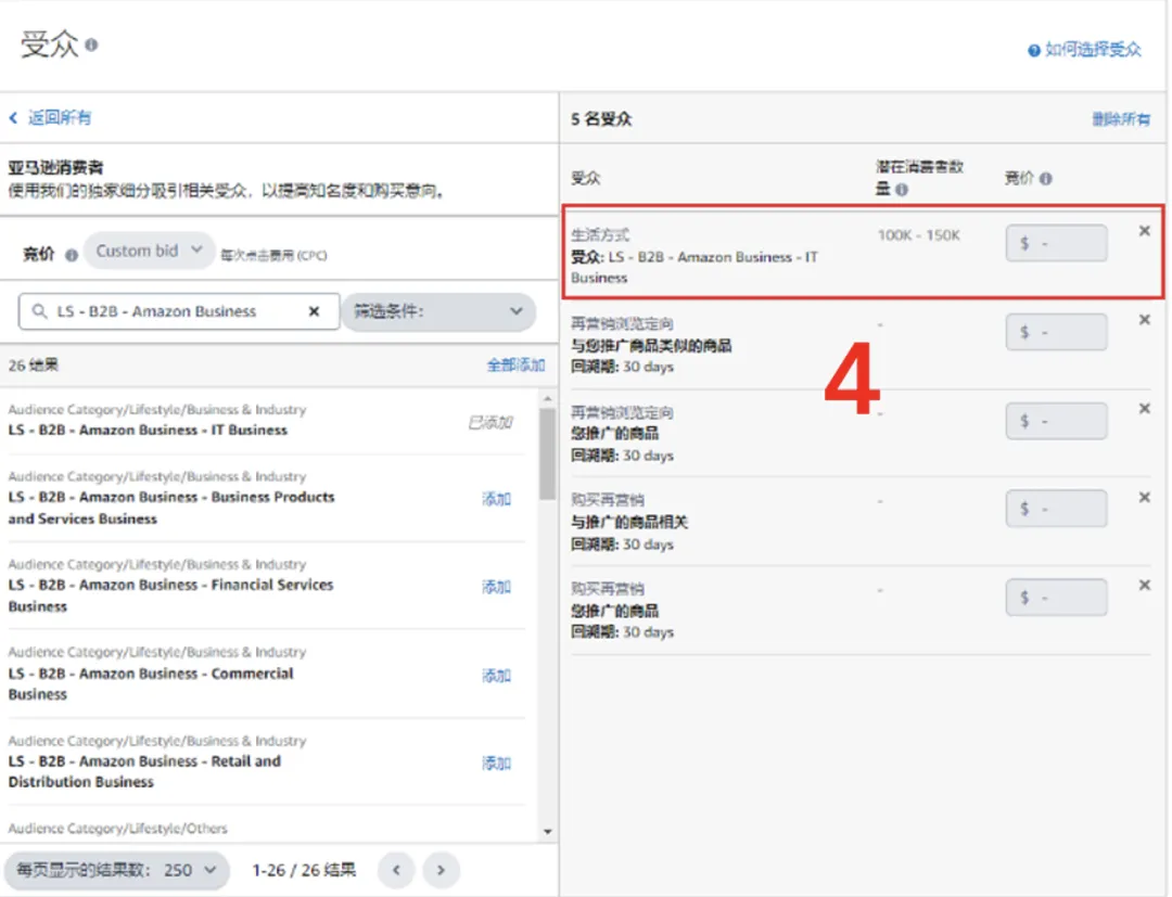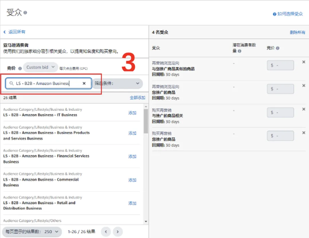 输入“LS - B2B - Amazon Business”,选择并添加目标受众。为每个受众设置竞价。
