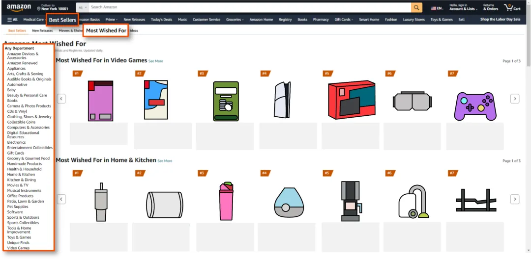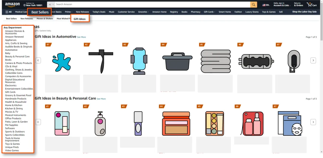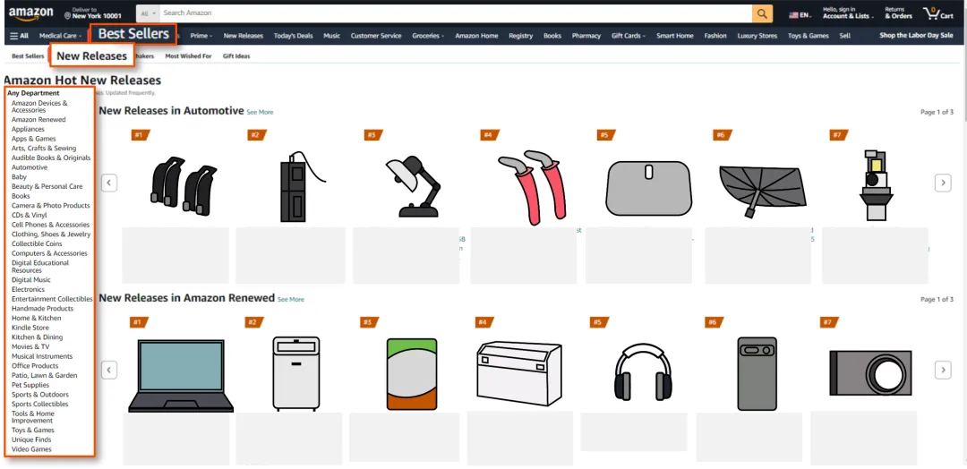 进入不同目的国/地区的亚马逊商城 > 点击黑底白字Best Sellers > 点击五大榜单标签页 > 选择榜单后挑选您感兴趣的类目详细了解。