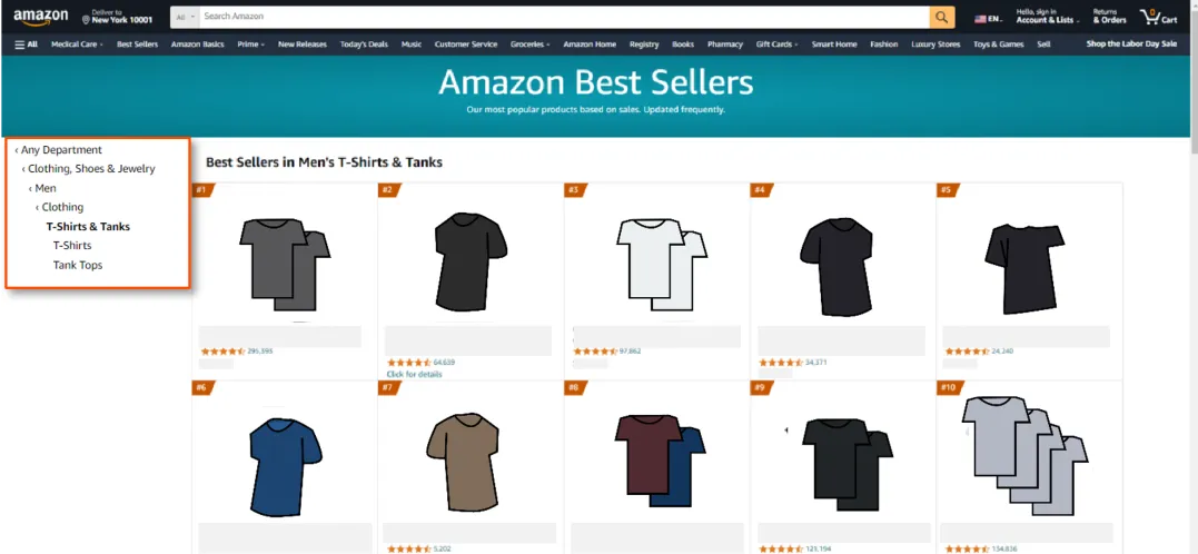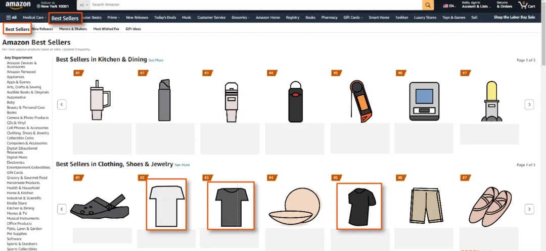 卖家A计划入驻亚马逊美国站,希望获取当地类目灵感,于是前往亚马逊商城首页打开Best Sellers(最畅销榜单)(界面如下图)发现鞋服品类热销Top7的产品中,有三款是男士T恤,推测这类商品具有较强的市场吸引力,可能会是一个机会。