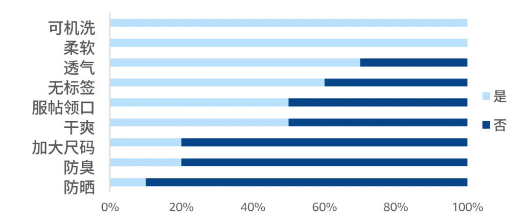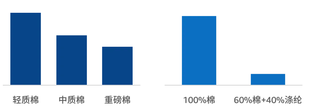 热卖单品以全棉为主,约一半为轻质棉,版型主要集中在圆领的合身(直筒)版型;可机洗、柔软是热卖商品的共同特征;其次,透气、无标签、防敏感等也是重要的产品特征。
