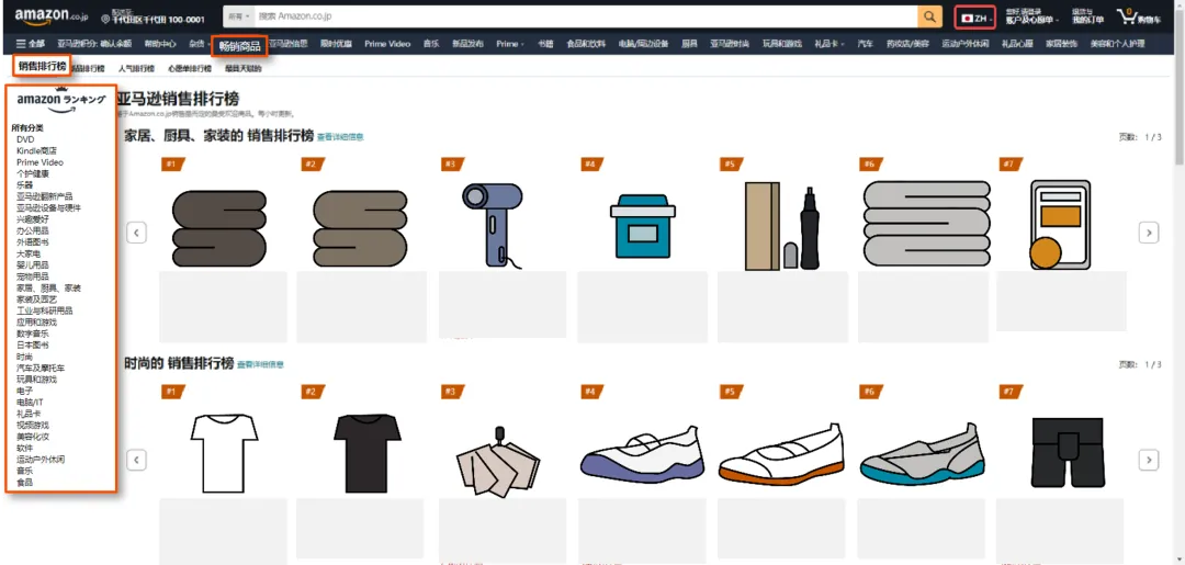 卖家B在保温杯方面的供应链资源较为成熟,猜想日本市场对保温杯需求比较大,因此进入亚马逊日本商城首页点击“畅销商品”,找到保温保冷杯类目(界面如下图)开始验证目标选品是否符合买家需求。