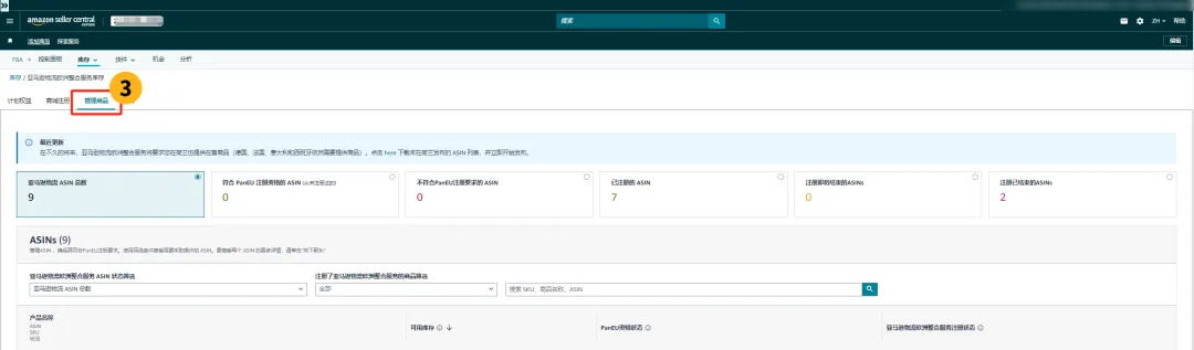 来到管理商品页面后,卖家可以根据页面提示,来分别定位已享受/未享受Pan-EU福利的ASIN。