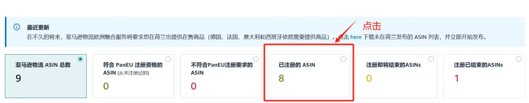 如下图依次点击“符合注册亚马逊物流欧洲整合服务的条件”/“注册即将结束”/“注册已结束” (如显示大于0)。