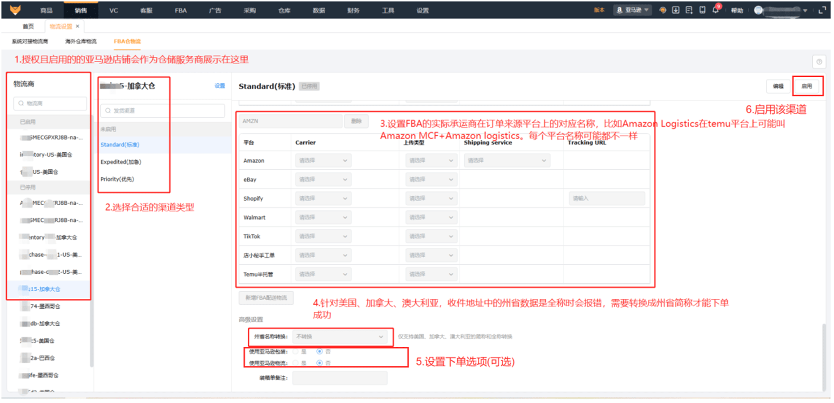 开启亚马逊FBA多渠道配送方式,【销售—物流设置—FBA仓物流,完善设置—启用渠道】: