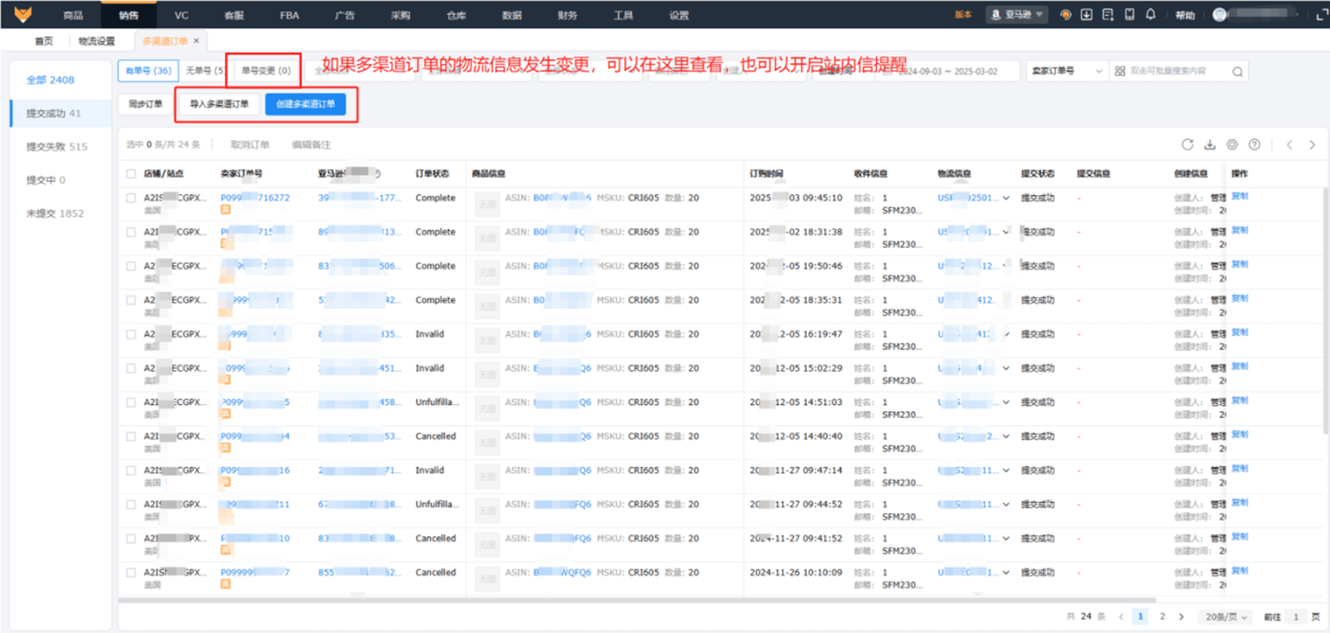 1.多渠道配送MCF订单列表,可以在盖页面中单个创建或者更通过文件批量导入创建多渠道配送MCF订单。如果多渠道订单物流信息发生变更,可以在单号变更页签中查看,也可以开启站内消息提醒,发生变更时自动提醒。这个页面中也会包含上述自发货自动转FBA仓发货的订单,对应的单号变更提醒也会支持此部分订单。