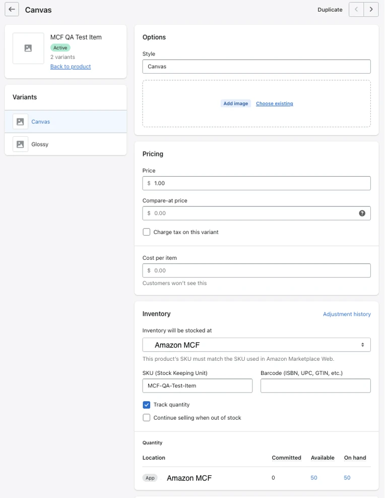 一旦您的SKU被映射,MCFApp就会将更新的库存水平从亚马逊推送到Shopify。