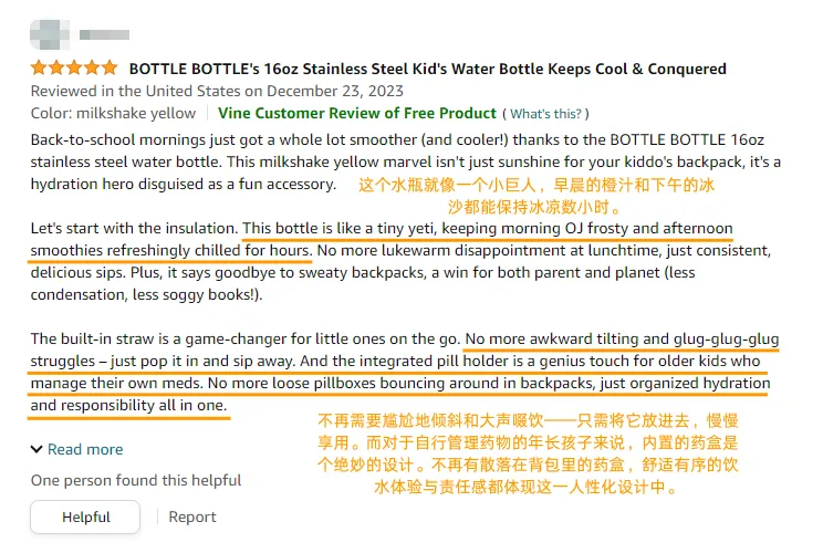 运营负责人Sue说:“我们有款吸管杯的产品,吸管是外插的,很容易开裂,其实这个情况在同品类中挺常见的,而我们注意到有许多买家反馈了好几次,于是我们从用户需求出发,迅速改进了盖子的设计。之后,我们还在A+页面与Listing重点强调了这个设计优化之处,这也成了我们和别的产品不一样的差异化卖点。“